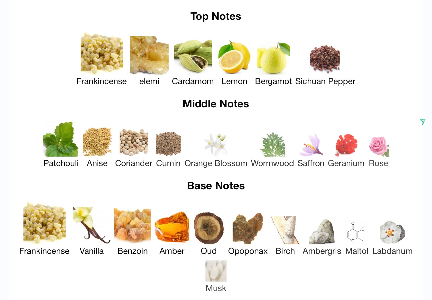 • Top notes: are Frankincense, elemi, Cardamom, Lemon, Bergamot and Sichuan Pepper
