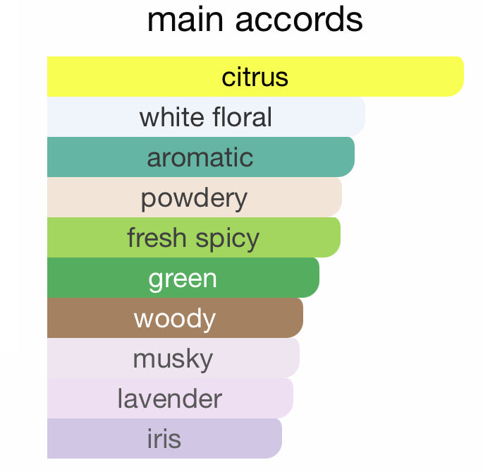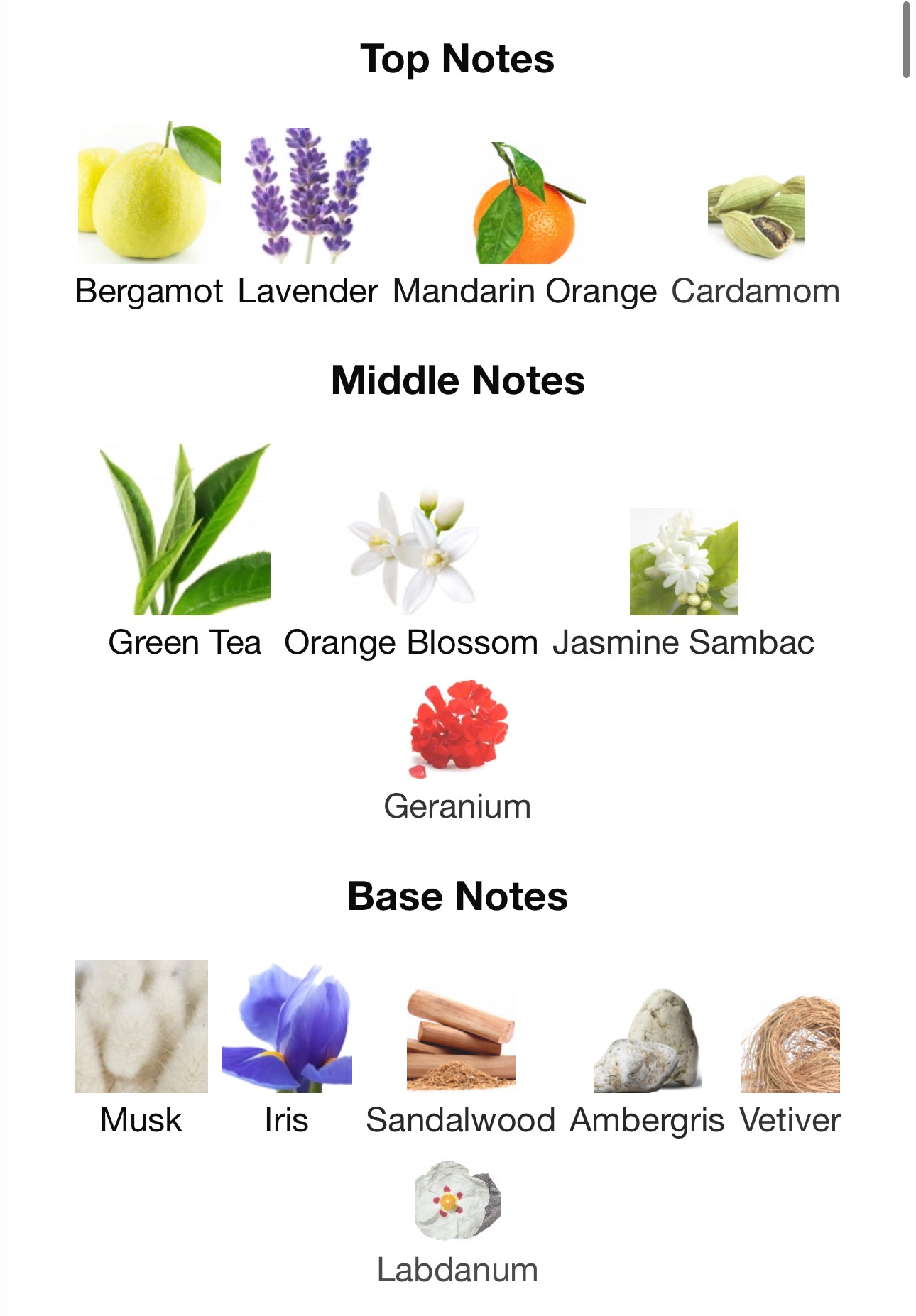 • Top notes: Bergamot, Lavender, Mandarin Orange and Cardamom