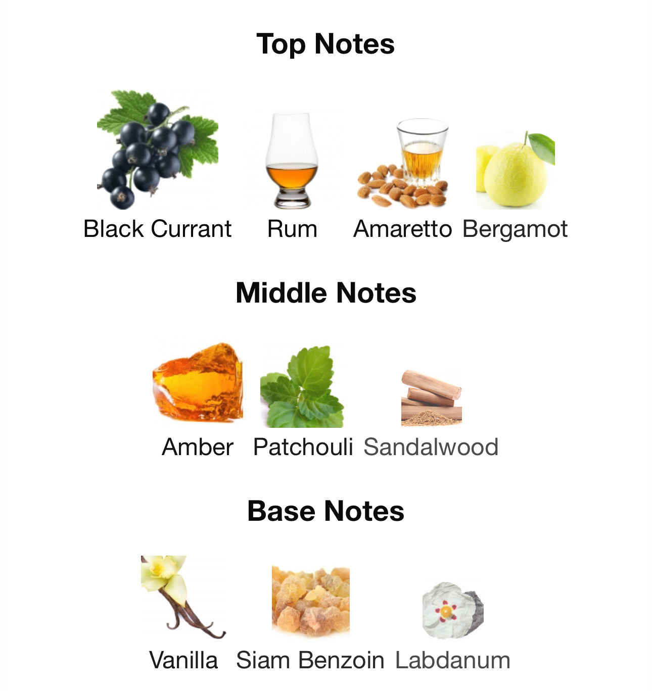 Top notes: Black Currant, Rum, Amaretto and Bergamot;